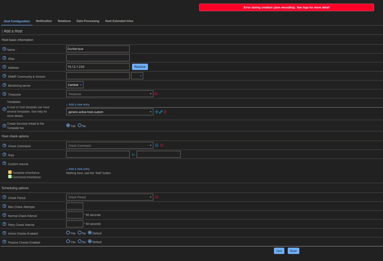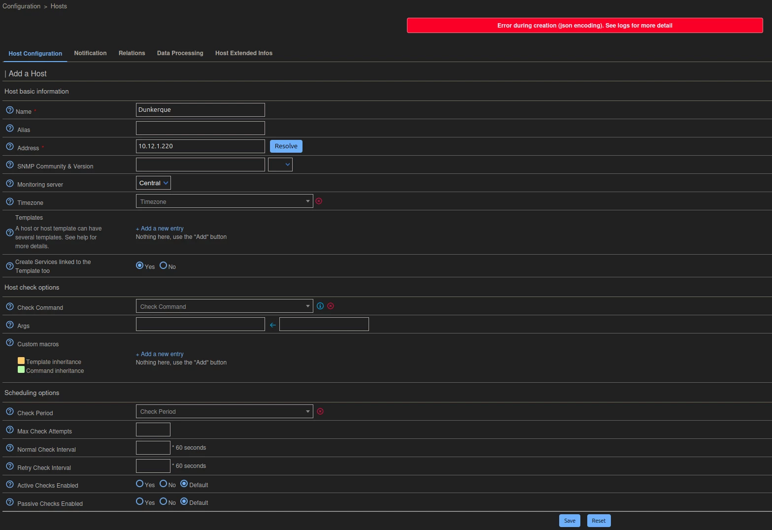 [2025-11-28T08:30:39+01:00] ERROR : Error during host/hostTemplate creation | {"custom":{"hostId":null,"isTemplate":false,"exception":{"message":"Syntax error","trace":"#0 /usr/share/centreon/www/include/configuration/configObject/host/DB-Func.php(2978): json_decode()\n#1 /usr/share/centreon/www/include/configuration/configObject/host/DB-Func.php(2825): callHostApi()\n#2 /usr/share/centreon/www/include/configuration/configObject/host/DB-Func.php(2733): insertByApi()\n#3 /usr/share/centreon/www/include/configuration/configObject/host/formHost.php(1132): insertHostInAPI()\n#4 /usr/share/centreon/www/include/configuration/configObject/host/host.php(102): require_once('...')\n#5 /usr/share/centreon/www/main.get.php(277): include_once('...')\n#6 {main}"}},"exception":null,"default":{"request_infos":{"uri":"/centreon/main.get.php?p=60101","http_method":"POST","server":"centreon"}}}