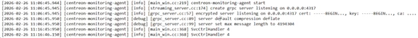 [2026-02-17 10:57:57.895] [centreon-monitoring-agent] [info] [grpc_server.cc:57] encrypted server listening on 0.0.0.0:4317 cert: -----BEGIN..., key: -----BEGIN..., ca: ....