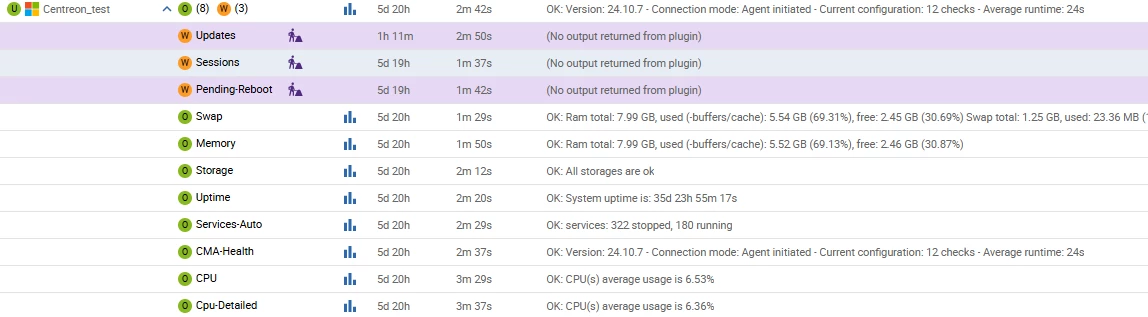 We are using CMA for windows, We configured it successfully, But proble is that some check are not working properly, You can see in below image that first 3 services which are Updates, Sessions, Pending-Reboot returning No Output returned from plugin.
