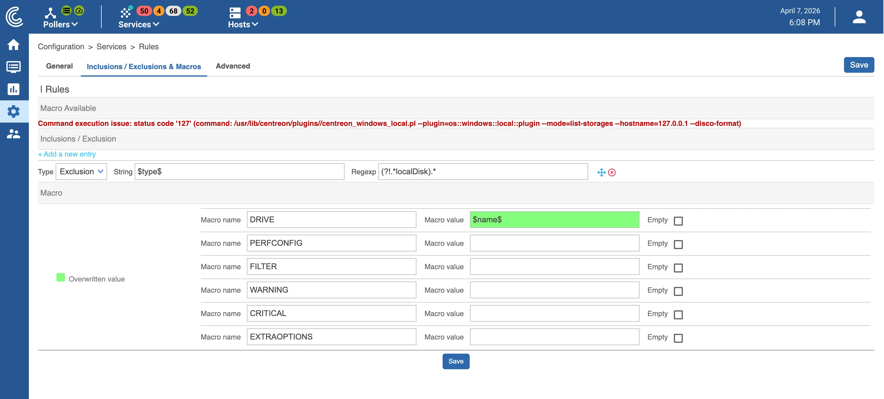 (command: /usr/lib/centreon/plugins//centreon_windows_local.pl --plugin=os::windows::local::plugin --mode=list-storages --hostname=127.0.0.1 --disco-format)