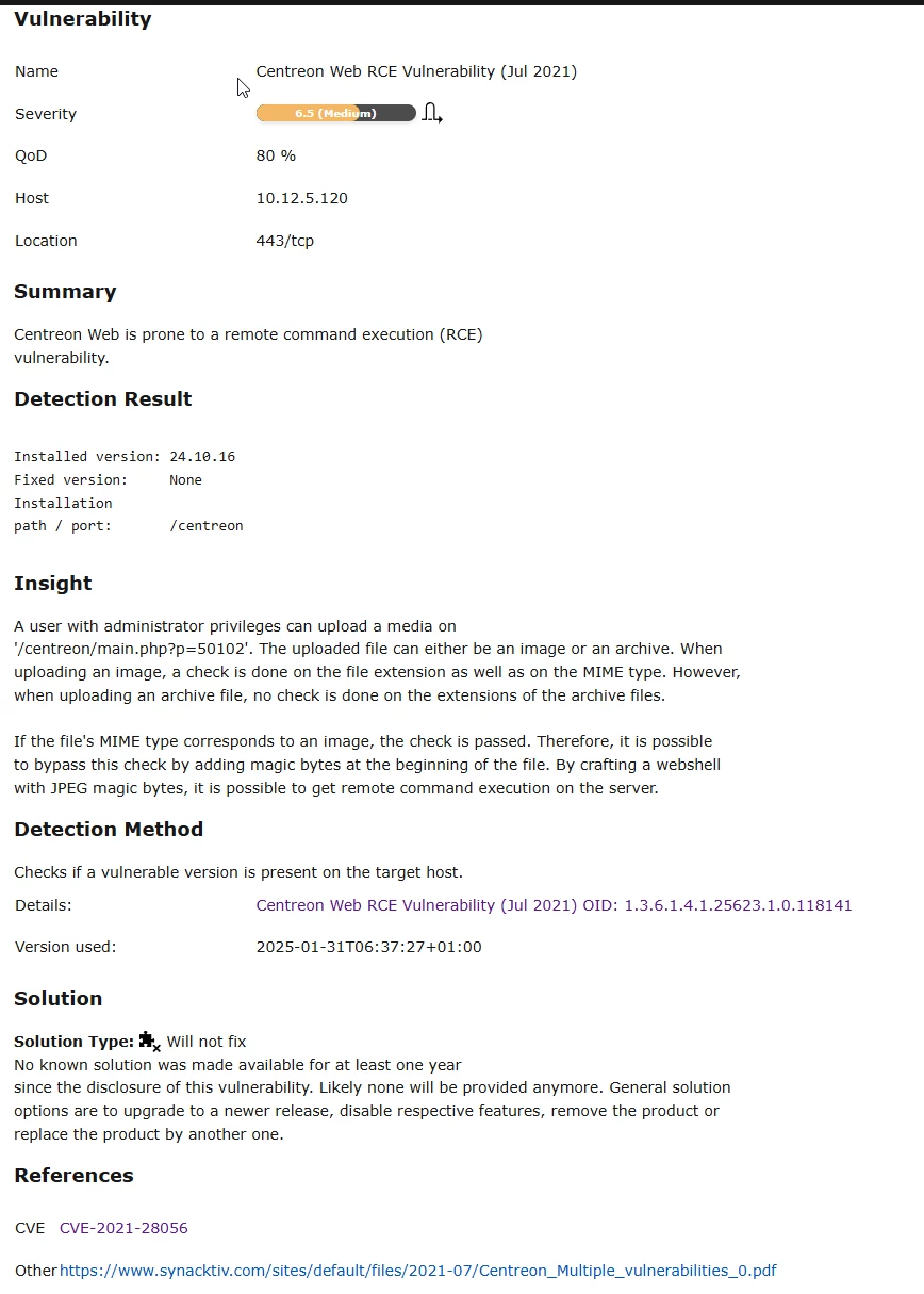 Out OpenVAS is reporting a RCE for centreon-web with a WontFix. Is it fixed? Will it be fixed? How to handle it?