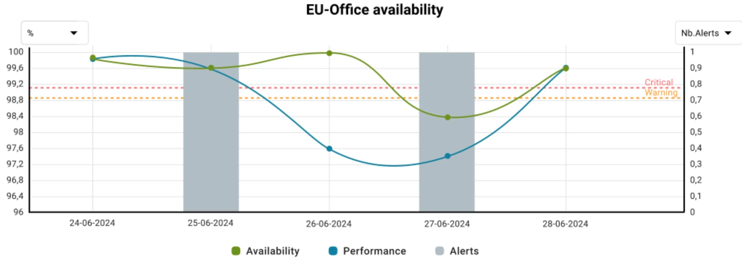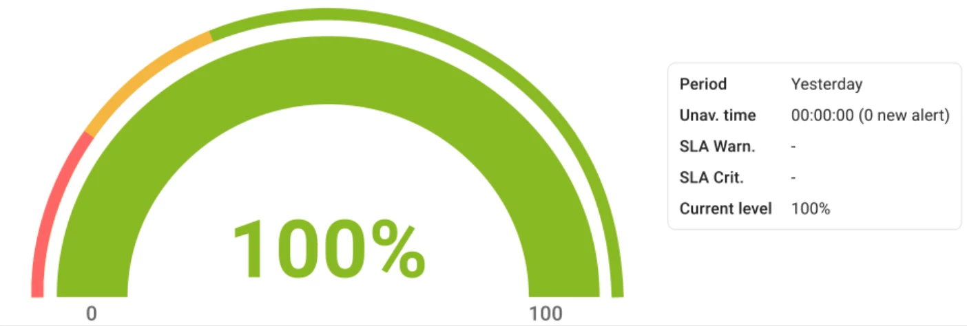 BA Availability: displays the availability of one Business Activity, its SLAs (if available) for the selected reporting period and the current BA level.
