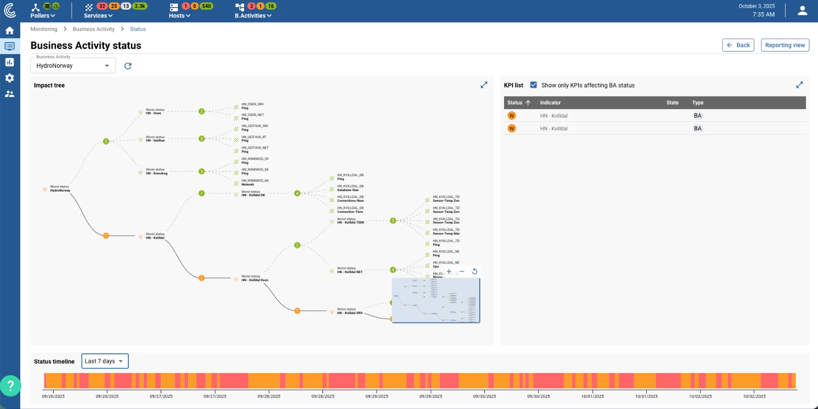 The first step, delivered in the 24.10 Service Pack, introduced new real-time dashboard widgets for monitoring business activities. With Centreon Infra Monitoring 25.10, this second step extends the same design and usability improvements to the BA monitoring page, which now brings together graph, list, and timeline views in a clear, intuitive, and real-time interface that makes monitoring business activities easier than ever.